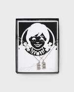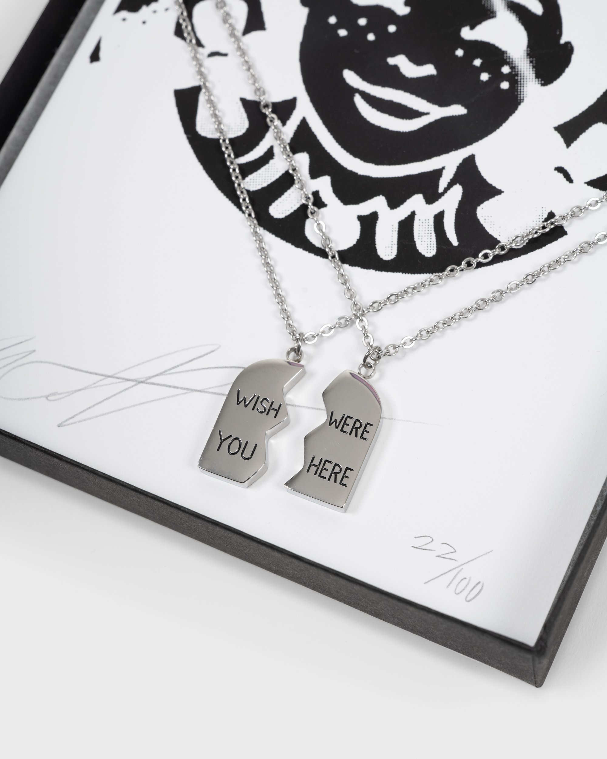 Necklace charm with chain in a bisected headstone shape, to be worn together or shared like turtle doves. The two charms form the phrase "Wish You Were Here". Charms are 1 inch tall by 1 inch wide together, and 0.125 inches thick. Cloisonné enamel in the engraved lettering.
